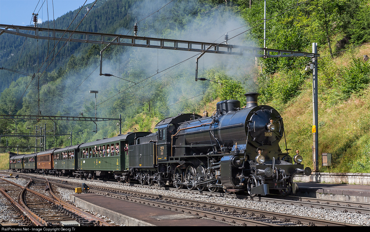 | The steamtrain for the "Schweiz aktuell" program of Swiss TV from Ersteld to Biasca is entering Wassen station for a short stop. The 2-10-0 four cylinder compound locomotive C 5/5 # 2978 "Elephant" from 1917 is pulling 5 passenger cars from the 1930' with a load of about 210 ton. |