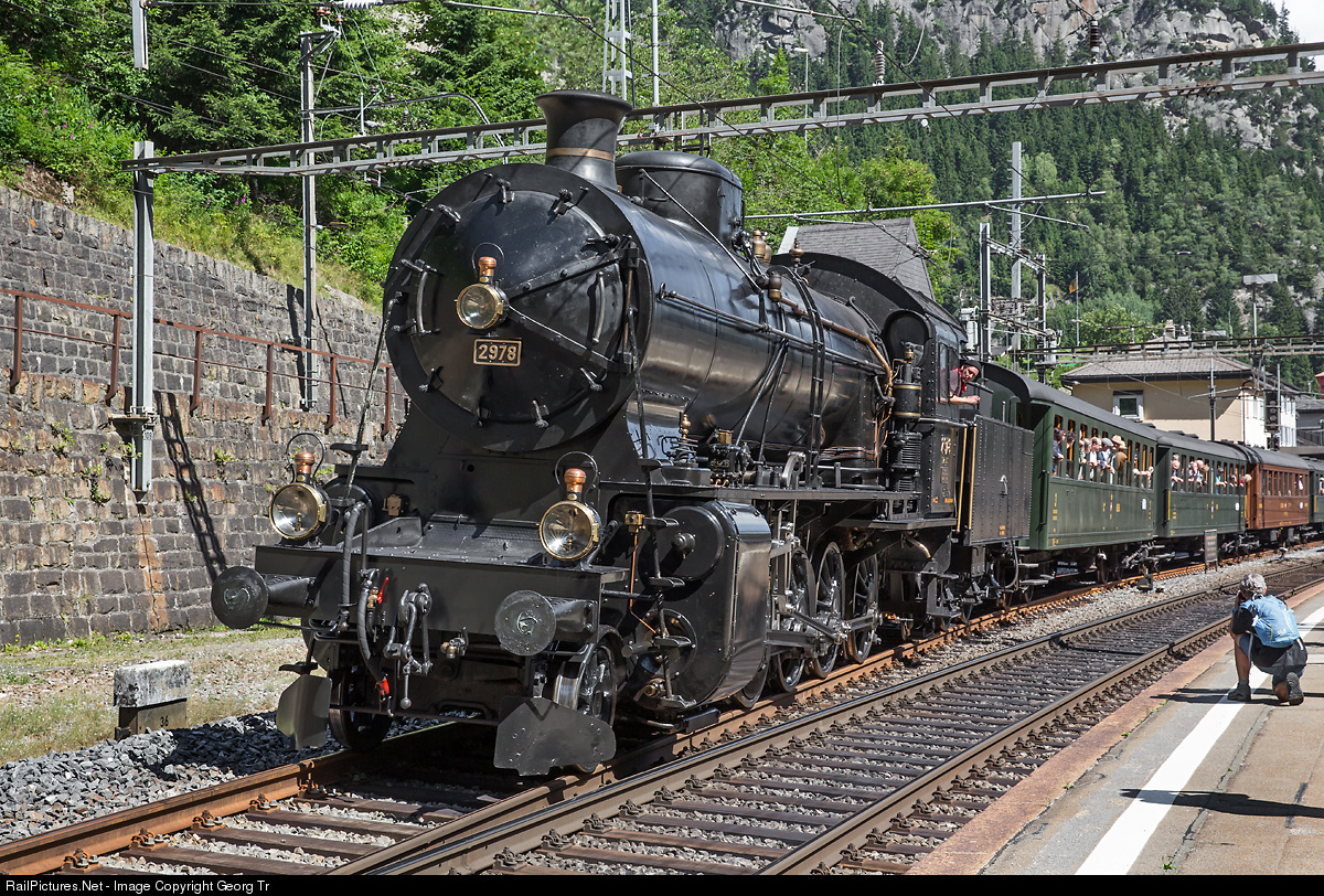 | The heavy four cylinder compound 2-10-0 freight steamlocomotive C 5/6 # 2978 "Elephant", built by SLM Winterthur in 1917 mainly for the steep Gotthard line, reached Göschenen with a passenger special for the Swiss TV. The train ran from Erstfeld to Biasca and back this day. |