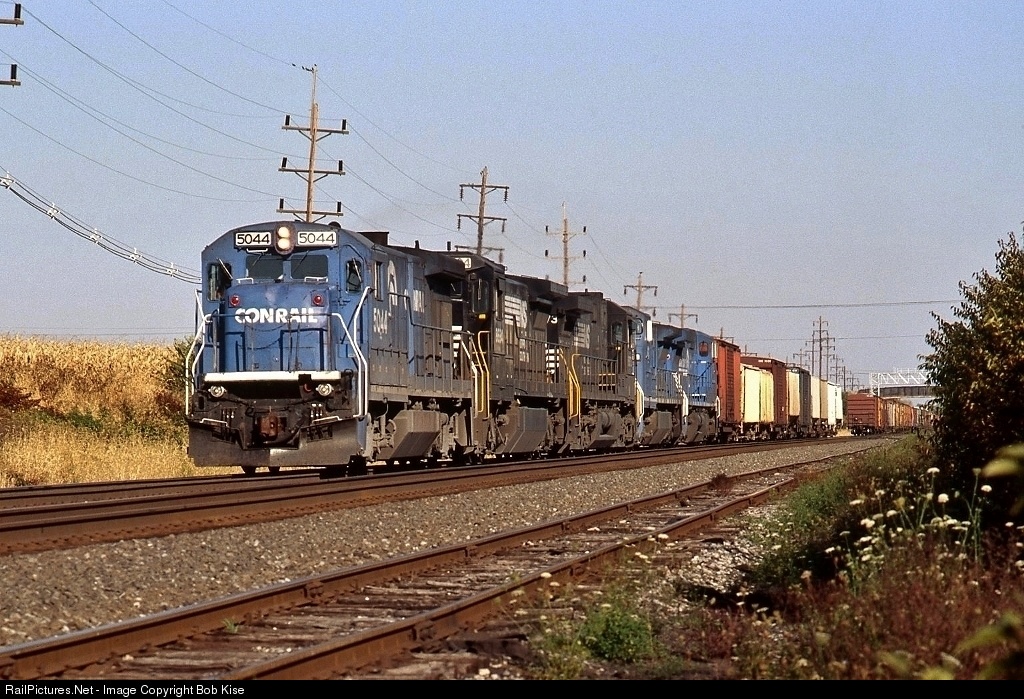 A GE B36-7 with a battered nose has uncoupled the first 10 cars of its train, preparing to make a set-off. This engine was built by GE for Conrail in December, 1983; one of 60 on CR's roster, 5000-5059. It was acquired by CSX in the late 90s and was renumbered as their No. 5801 and was later shipped to Brazil, last working for Valor da Logistica Integrada as their No. 740.