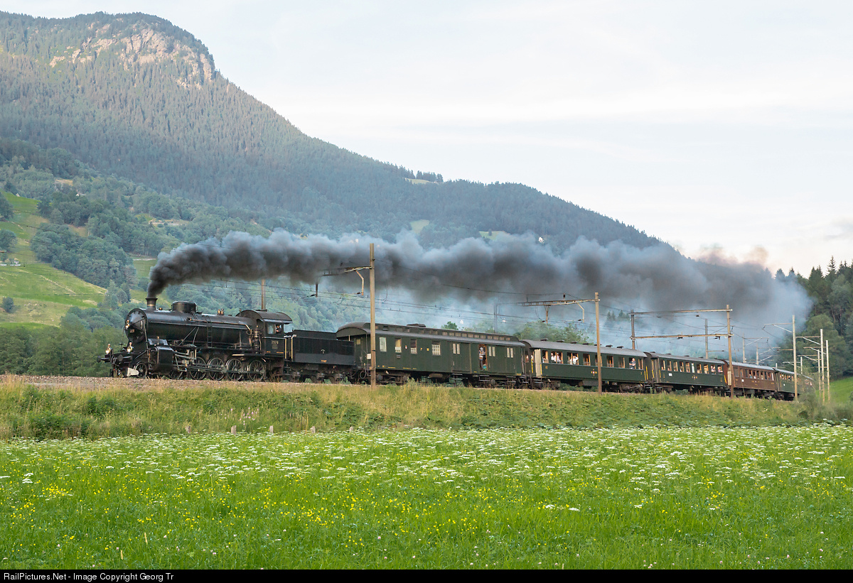 | The heavy four cylinder compound 2-10-0 freight steamlocomotive C 5/6 # 2978 "Elephant", built by SLM Winterthur in 1917 mainly for the steep Gotthard line, with a six car passenger special from Biasca to Erstfeld for the "Schweiz aktuell" program of Swiss TV, running full speed with the late train near Ambri-Piotta. |