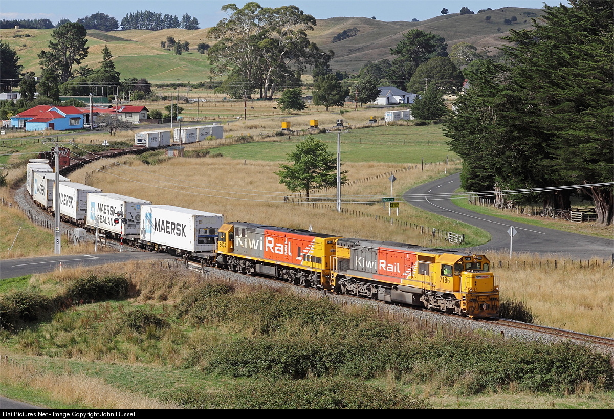 Trains on 3' 6" (1.067m) track from Whangarei to Bluff with virtually heritage rebuilt EMD and GE locomotives still the mainstay power. The network was privatized in 1990's and operated by Toll until 2008 when state owned KiwiRail was established.