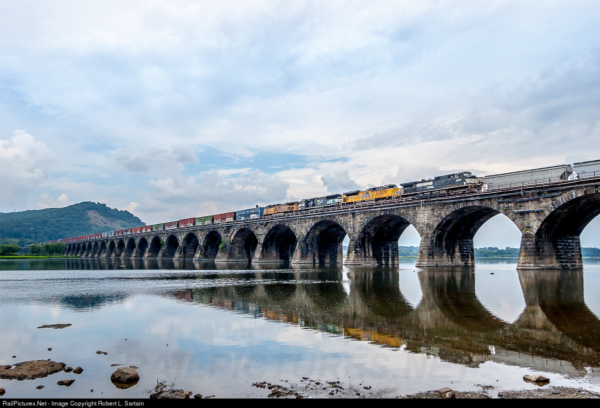 | With a colorful consist, including one of Norfolk Southern's "GoRail" units and two Union Pacific locomotives, NS manifest train 19G heads west across historic Rockville Bridge. |