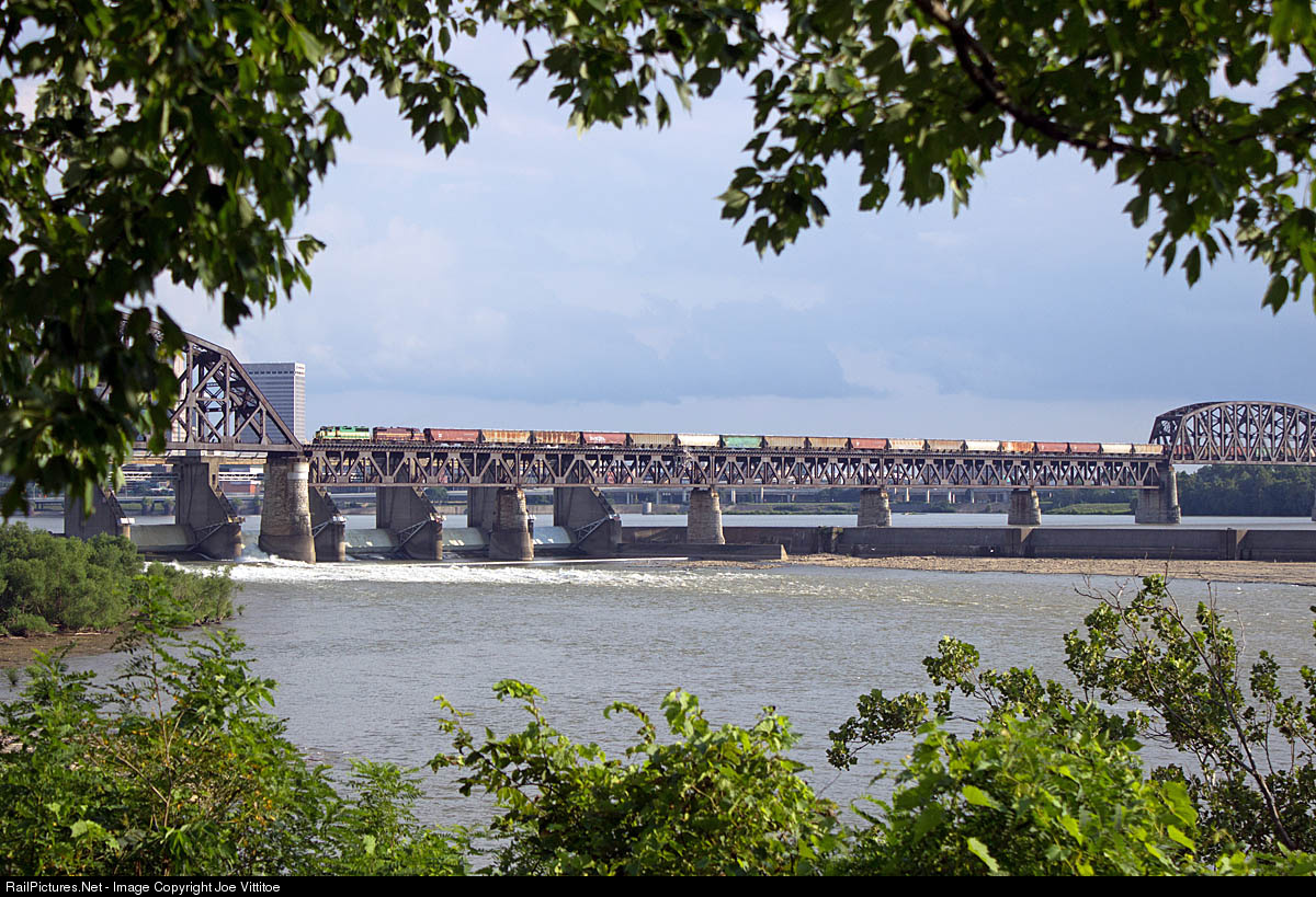 Northbound LIRC's J12A31 crosses the Ohio River after picking up cars from the NS.