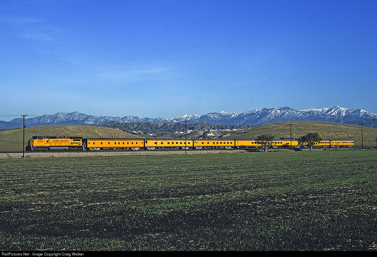 A special for the Los Angeles County Transportation Commission, consisting of Union Pacific Dash 8-40CW 9386 and seven cars, heads west through Walnut, California, on January 10th, 1992. LACTC was successful in passing two half cent sales taxes for transportation improvements in southern California, which facilitated the construction of light rail, heavy rail (Metrolink), HOV/Carpool lanes, busways, soundwalls, bicycle facilities and park-n-ride facilities. Metrolink would begin service on October 26th, 1992, and this Union Pacific line would become Metrolink's Riverside Line, connecting Riverside with downtown Los Angeles.