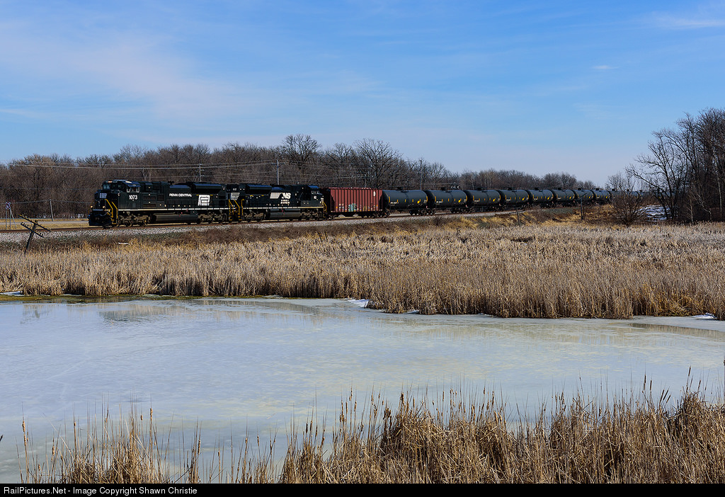 NS 1073, the Penn Central heritage locomotive leads an empty oil train west to North Dakota.
