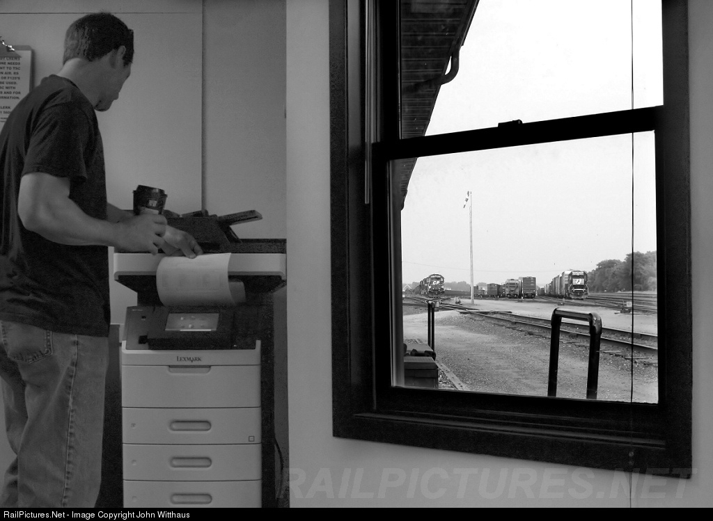 | Some Things Remain the Same: Although technology has changed over the years, the routine of most railroaders remains the same. Here a CP engineer checks the paperwork at the fax for track bulletins and train paperwork which he will review before getting on his train. Taken while off duty, wearing full PPE. |