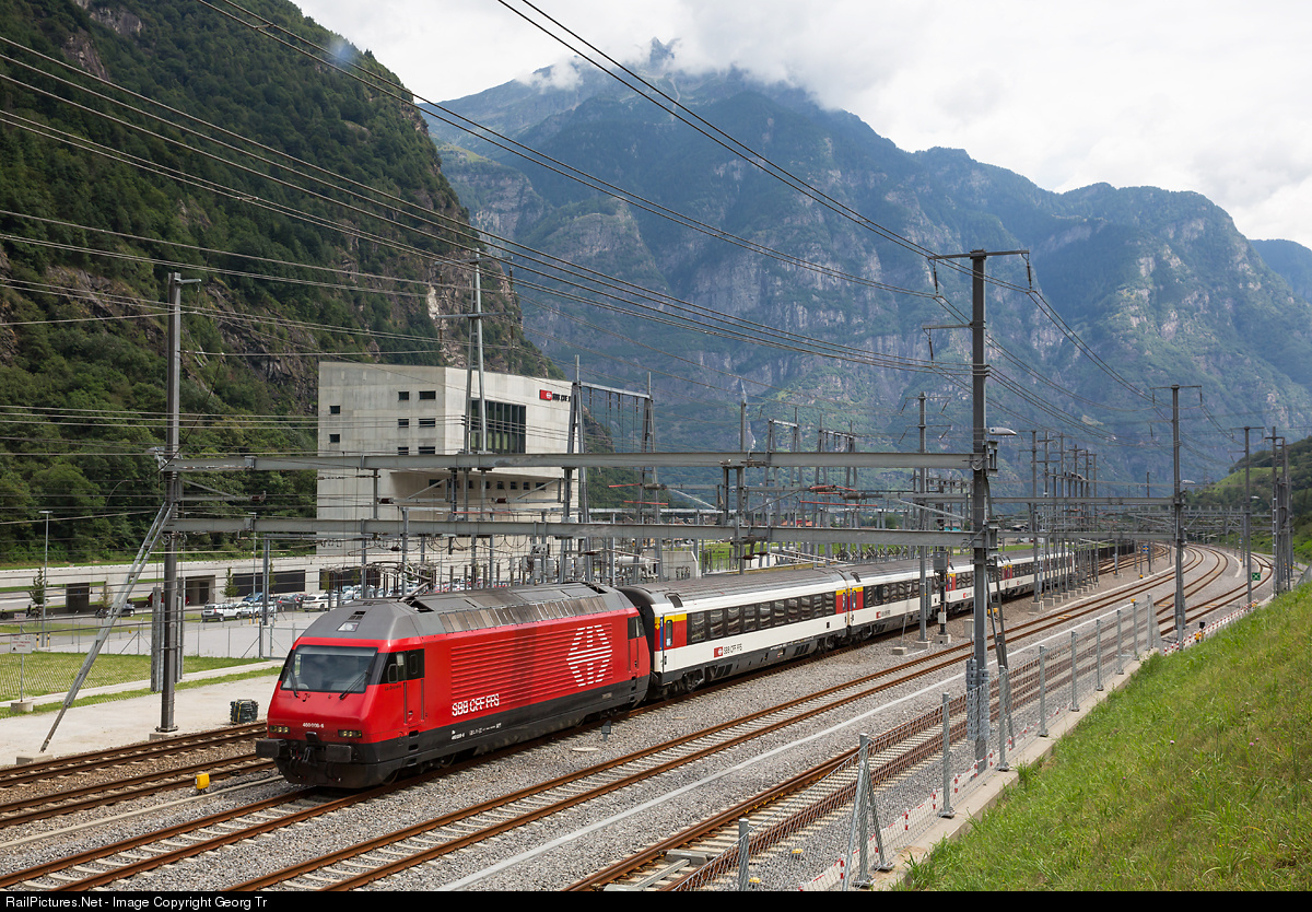 | "Gottardino" push pull train with Re 460 # 008, 4 Apm first class cars and cab car Bt in front of the operation center sud in Pollegio. The train travelles through the 57 kilometer long Gotthard Base Tunnel two times a day from today till november, stopping for about one hour in the multifunction station of Sedrun, several hundred meters below the swiss alps. |