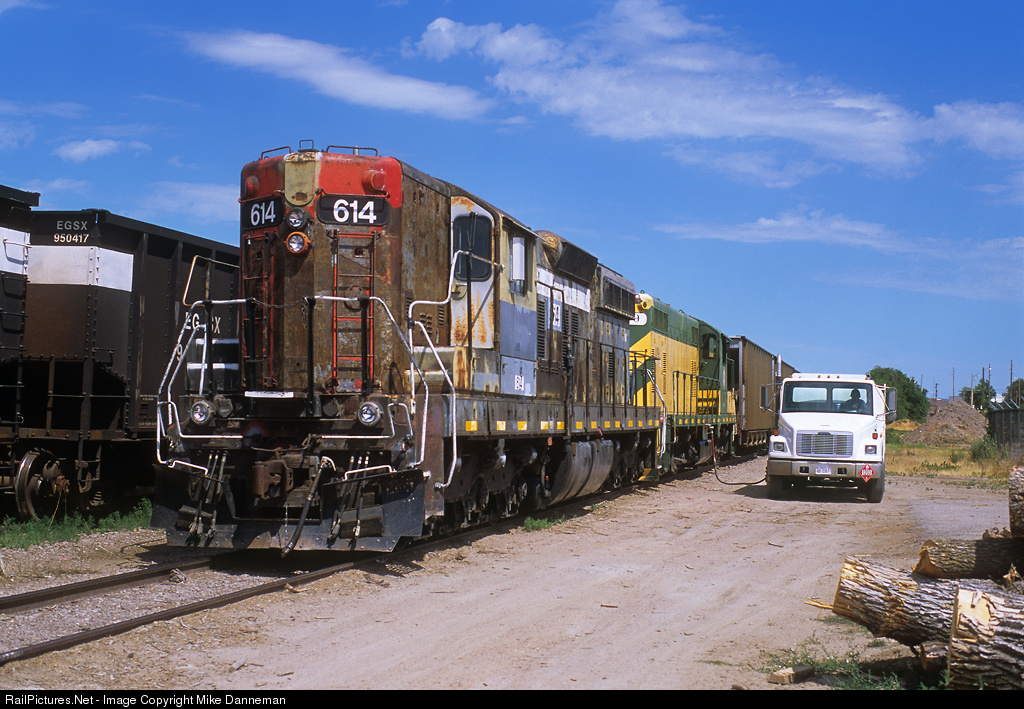 Probably one of the most paintless, patched, rusty locomotives I have ever photographed that was still active sits at Chadron, Nebraska, on July 14, 2008. But hey, at least it’s an SD9! Nebkota No. 614 is former Southern Pacific unit, last wearing No. 4353, and is being fueled with Nebkota GP7 No. 49, which is a former Rio Grande locomotive. No. 49 is painted in a Chicago and North Western-like livery, which will later adorn 614 too.