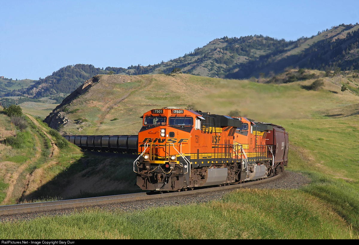July 5th at 9:05 am....Beautiful morning sun shine greets this East Bound empty grain led by a shiny ES44DC # 7501 as it flies down the East side of Montana's Bozeman Pass. What a sight it was to watch this long train slink around the many many curves on the pass...This guy wasted no time on the hill that is for sure... This Was Northern Pacific's Main line at one time, this track is now operated by the Montana Rail Link