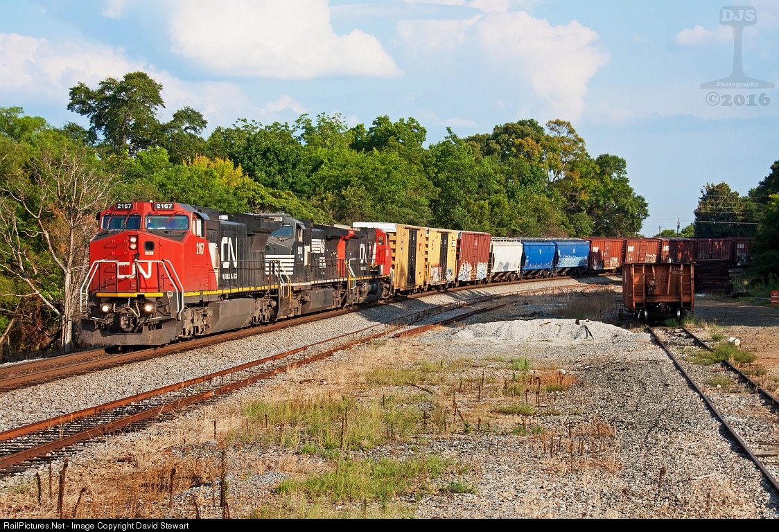 | The pair of CN C40-8Ws bracketing a NS CW40-9 which arrived on 175 earlier in the morning only spent seven hours at Brosnan Yard before heading back north with the counterpart train, 174 seen in this view making good time on the Atlanta South District as it passes through McDonough, Georgia. |