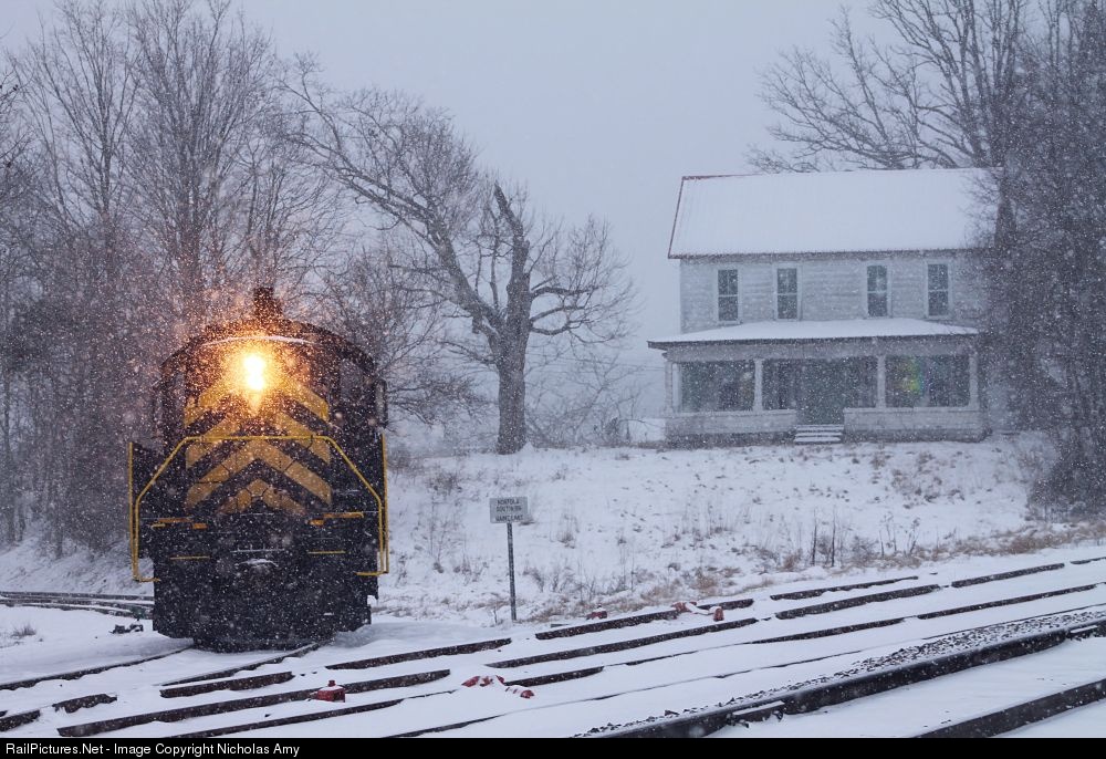 A heavy snow continues to fall over Southern Indiana as LNAC's Alco S4 can be found waiting for NS local D10 to arrive at Corydon Junction.