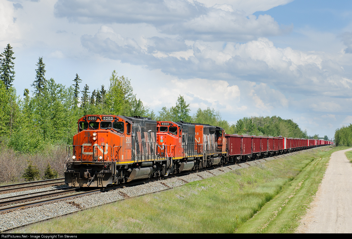 | After changing from W905 (work train crew) to O485 (mainline crew) at Edson, CN SD40-2Ws 5263-5265-5298 continue west on the Edson Sub with ballast empties for McAbee BC. |