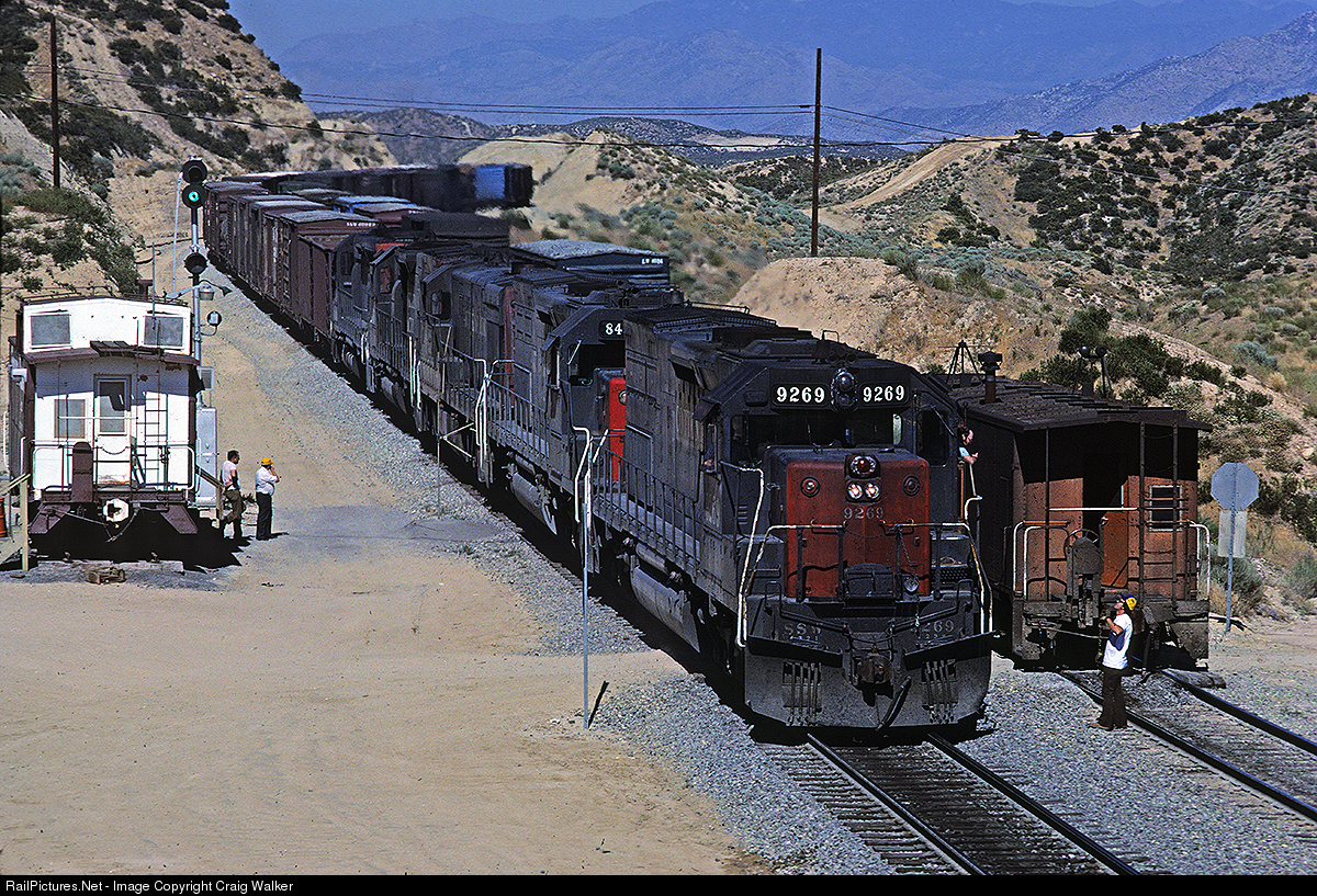 There's a lot of activity at Hiland, the summit of the Southern Pacific's crossing of Cajon Pass, on July 2, 1978. A westbound sits in the siding as an eastbound, led by Cotton Belt SD45T-2 9269, pauses to "discuss management" (because what else could they be discussing?) with the conductor of the westbound. Meanwhile, the crew of the trainorder station (the converted cupola caboose with white ends) get some fresh air and gets ready to give the eastbound a roll-by inspection. This line, the Palmdale Cutoff, is dark territory, with no signals, and thus train movements are controlled by trainorders.