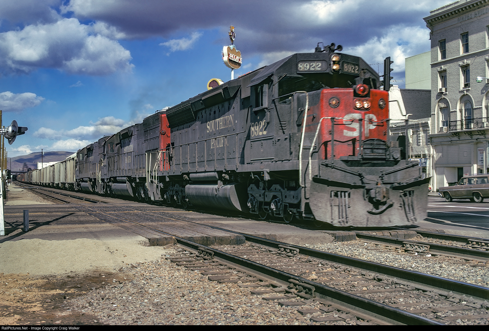 On May 19, 1974, Southern Pacific 8922 west bisects downtown Reno, Nevada, skirting along some of the city's famous casinos (such as the Palace Casino, the sign for which can be seen above the train). This manifest is powered by an SD45, SD45T-2 and SD40T-2 - iconic locomotives on the Espee in the 1970s.