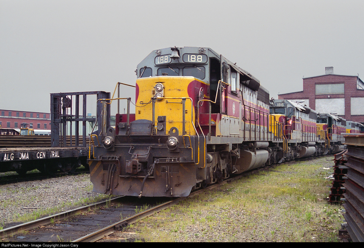 Algoma Central 188 is a early model SD40-2 built in 1973. The quartet makes a tough looking consist outside the Algoma shop complex in Sault Ste. Marie, Ontario. I was somewhat amazed that even at this mid 90s date a photo release waiver could be signed to wander around the yard... I wish more photos of freight operations on the Algoma Central were out there. I suppose the lack of population and remoteness of this area of the continent deterred rail fanning of the Algoma.