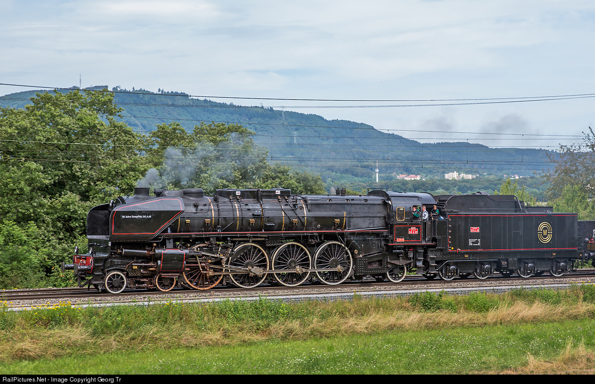 Former french railway express train steamlocomotive 241 A 65 (former ETAT 241 001), a four cylinder compound (de Glehn design) built in 1931 by Fives/Lille for the "Chemin de fer de l'ETAT", is coal fired (with stoker) and has about 3500 HP, max. velocity was 110 km/h (today in Switzerland 100 km/h). Driving wheel diameter 1950 mm or 6.4 ft, weight in working order with tender 200 ton. The locomotive is operational for association "241 A 65" and based in Full/Argovie. It is on a run to Basel and back to turn it for the journey the next day.
