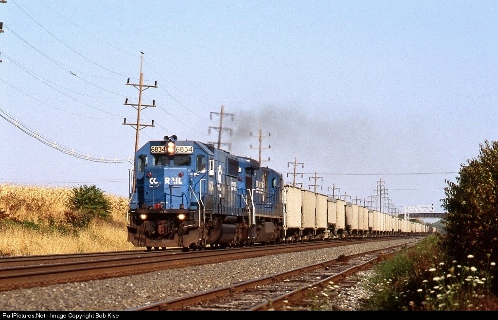 Conrail's last of a fleet of 135 SD50s (Nos. 6700-6834) is in need of some touch-up paint on the nose as it leads a smoky GE on a westbound ballast express. The 6834 was built by EMD in February, 1986 with 3,600 hp vs. the standard 3,500 (6780-6834 were CR's uprated units) and eventually ended up on the Kansas City Southern as their No. 7018.