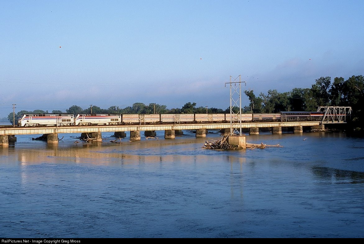 Amtrak 826 crosses the Platte River with the Cal Zephyr in the summer of 1994. Baggage cars really date this photo.