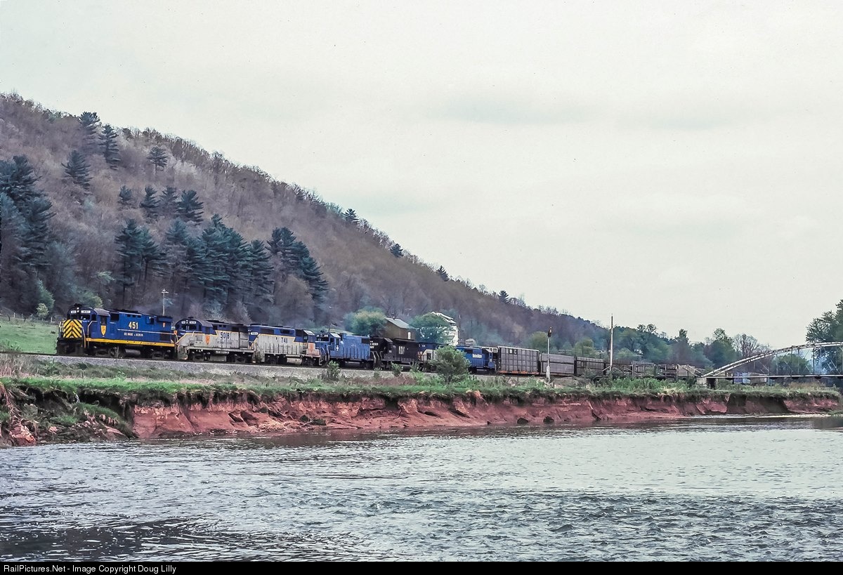 A dogpack of Alcos and EMDs from the Delaware & Hudson, Boston & Maine, and Norfolk & Western lead a westbound D&H train along the Canisteo River in Cameron Mills, New York. The highway truss bridge is probably not much newer than the semaphore, which dates to the late teens.