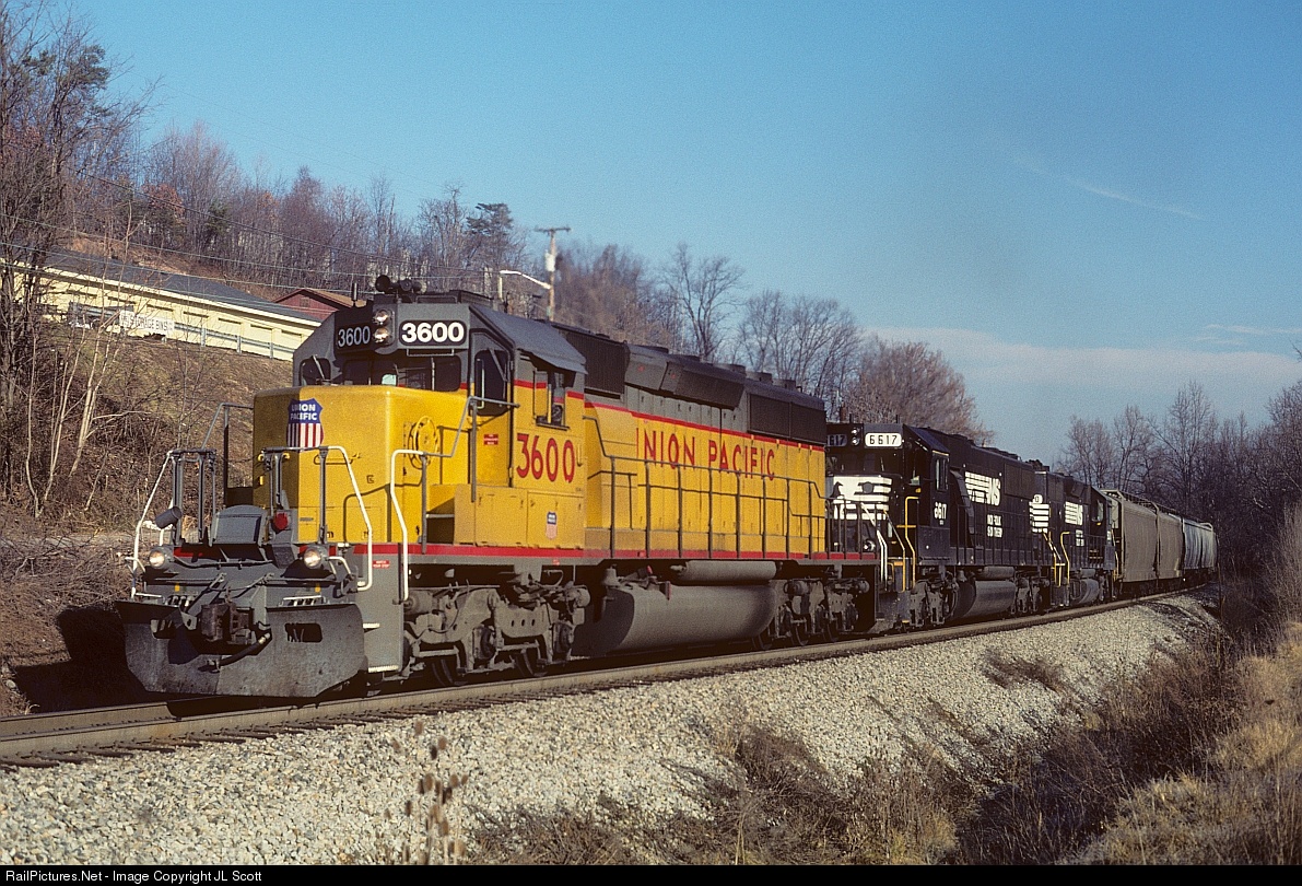 NS 54T is just below the crest of Starkey Hill (southbound) with UP 3600 in command followed by an NS SD60 and GP38-2. The UP leader is UP how I like it: no flag and a red frame stripe. Now I'm the biggest American Flag supporter you'll ever meet, just not while flaking off the side of a UP carbody. As for the red frame stripe, well the FRA fixed that in all their infinite wisdom...