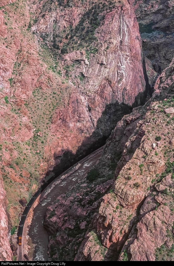 Viewed from the Royal Gorge suspension bridge, Rio Grande train 788 negotiates the narrowest section of the Gorge. Originating at the Roadside Mine at Cameo, Colorado, this train of coal has successfully descended Tennessee Pass, and will soon be on the Colorado plains, on its way to Mississippi Power’s plant in Daniel, Mississippi.