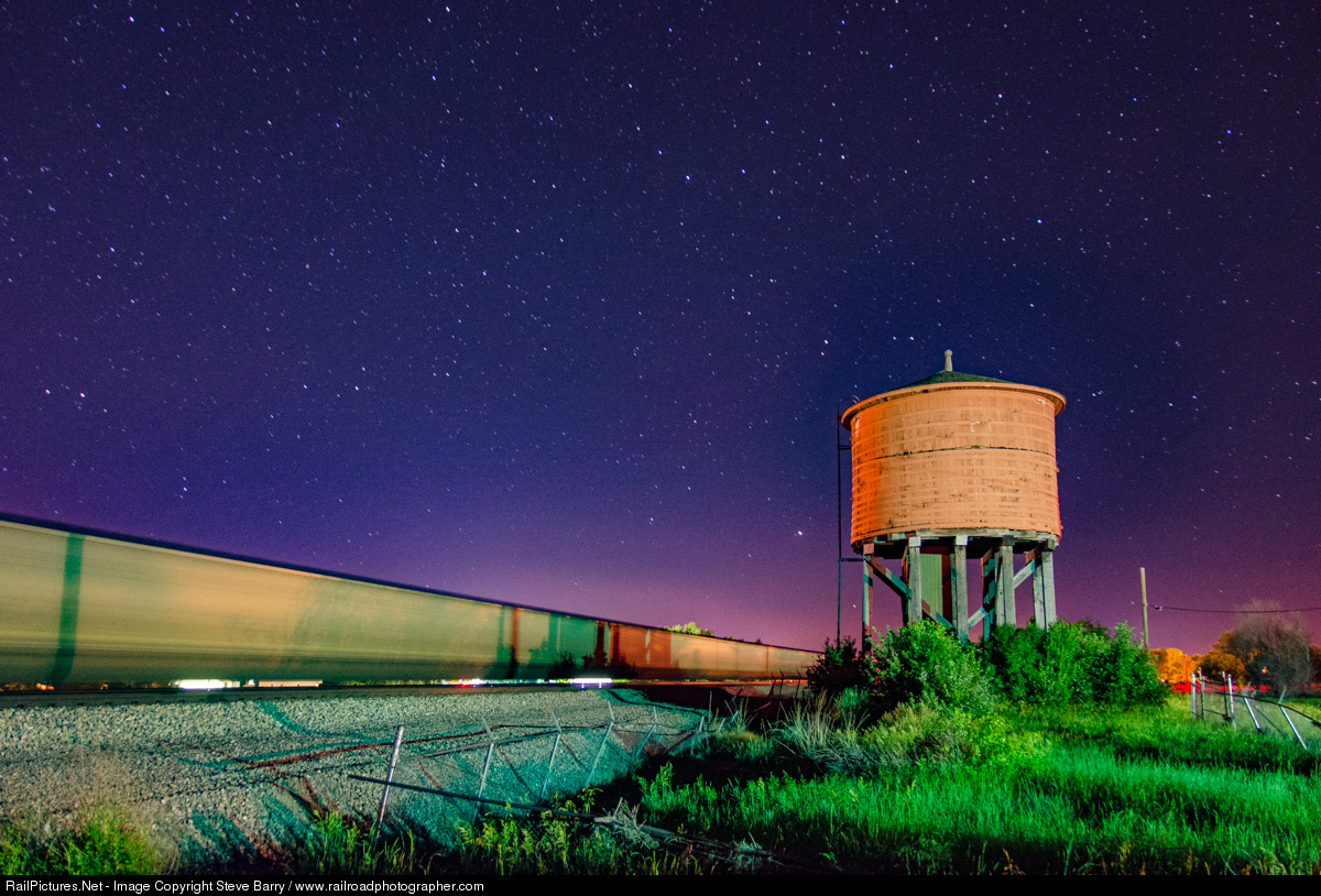 Under the stars, a Union Pacific freight passes the old water tank in Lusk, Wyo.
