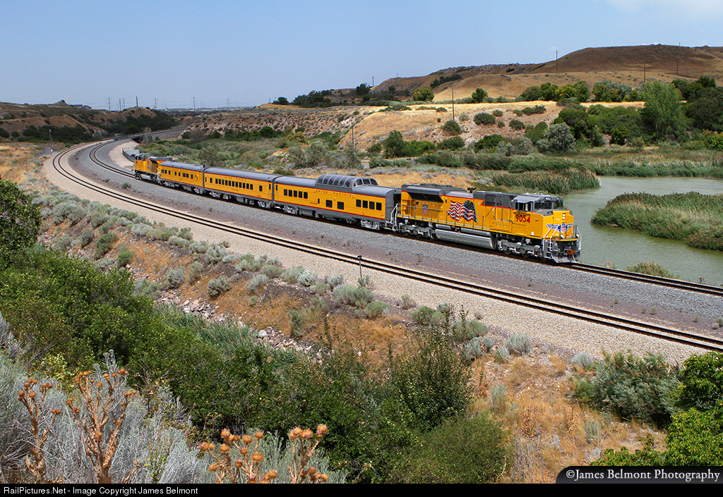 A Union Pacific Operation Lifesaver Special, traveling between Salt Lake City and American Fork, Utah rolls eastward through the Jordan Narrows with UP SD70AH No. 9054 leading the Columbine, City of Salina, and Cheyenne passenger/business cars with SD70AH No. 9051 trailing on Aug. 10, 2016.