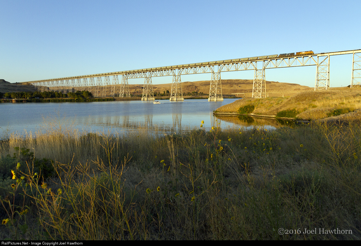 A southbound Union Pacific potash train traverses the Snake River at Lyons Ferry, WA during the last few minutes of waning sunlight of a hot summer day