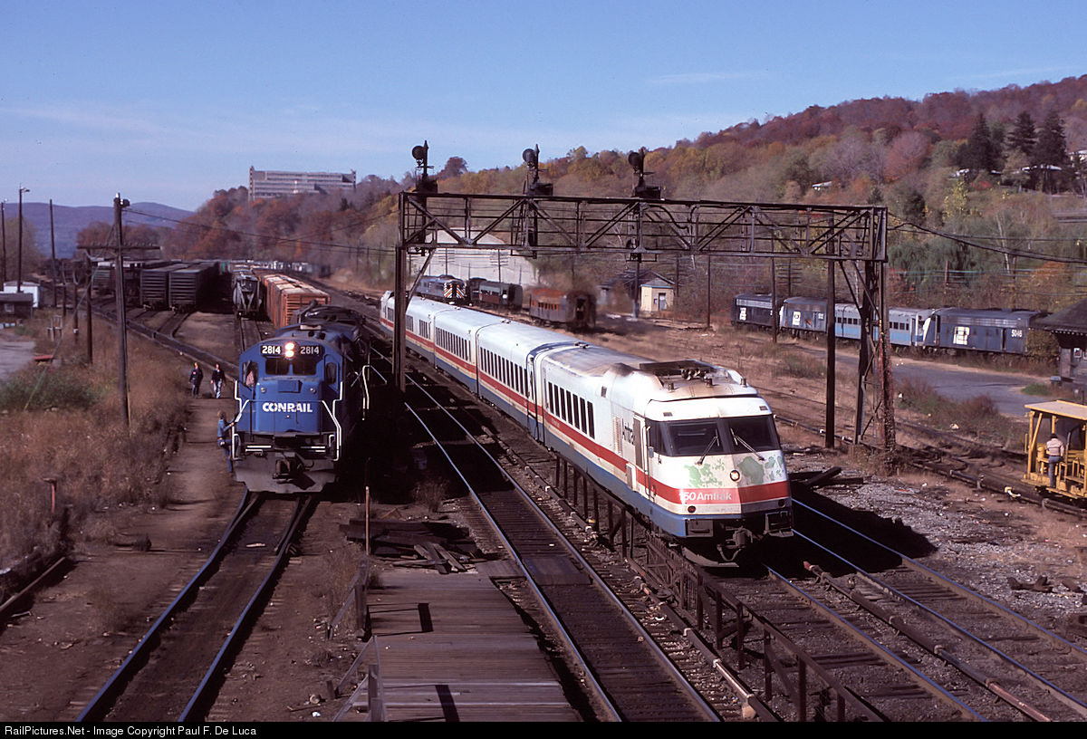 An Amtrak Rohr Turbo train heads for the station stop at Croton Harmon while a Conrail freight with GM auto parts for Tarrytown works the Croton North Yard. In the background is a collection of Conrail scrap metal, including FL9's, an RDC, an ex NYCRR MU and S motor, as well as other passenger equipment.