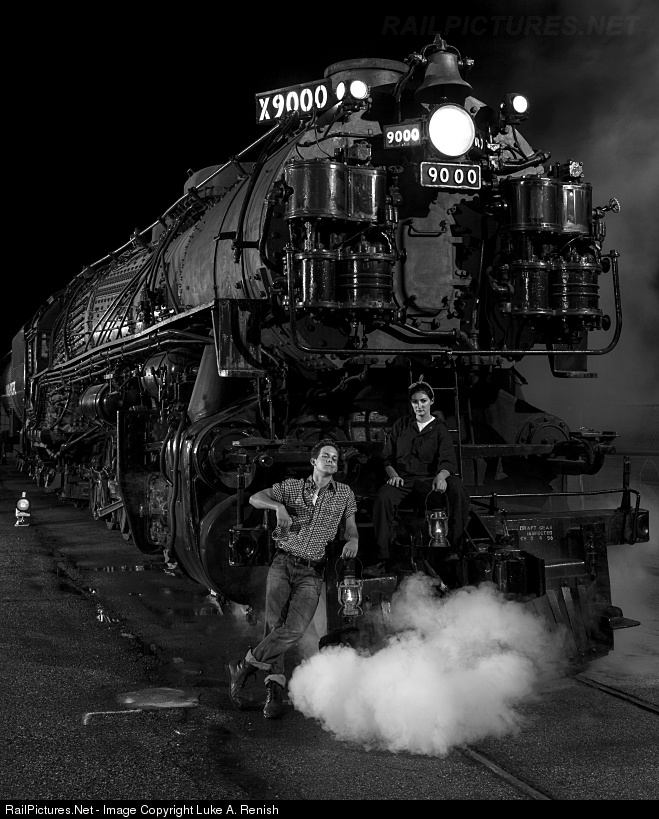 In what easily could have been a scene out of the early 1940's UP 9000, the first of 88 3-cylinder 4-12-2 behemoths ordered by Union Pacific from ALCo beginning in 1926, poses along with crew members for the flashbulbs. Thanks to Steve Crise and the Rail Giants Museum at the Pomona Failrplex for providing the lighting, locomotives, and period-dressed actors for the shoot.