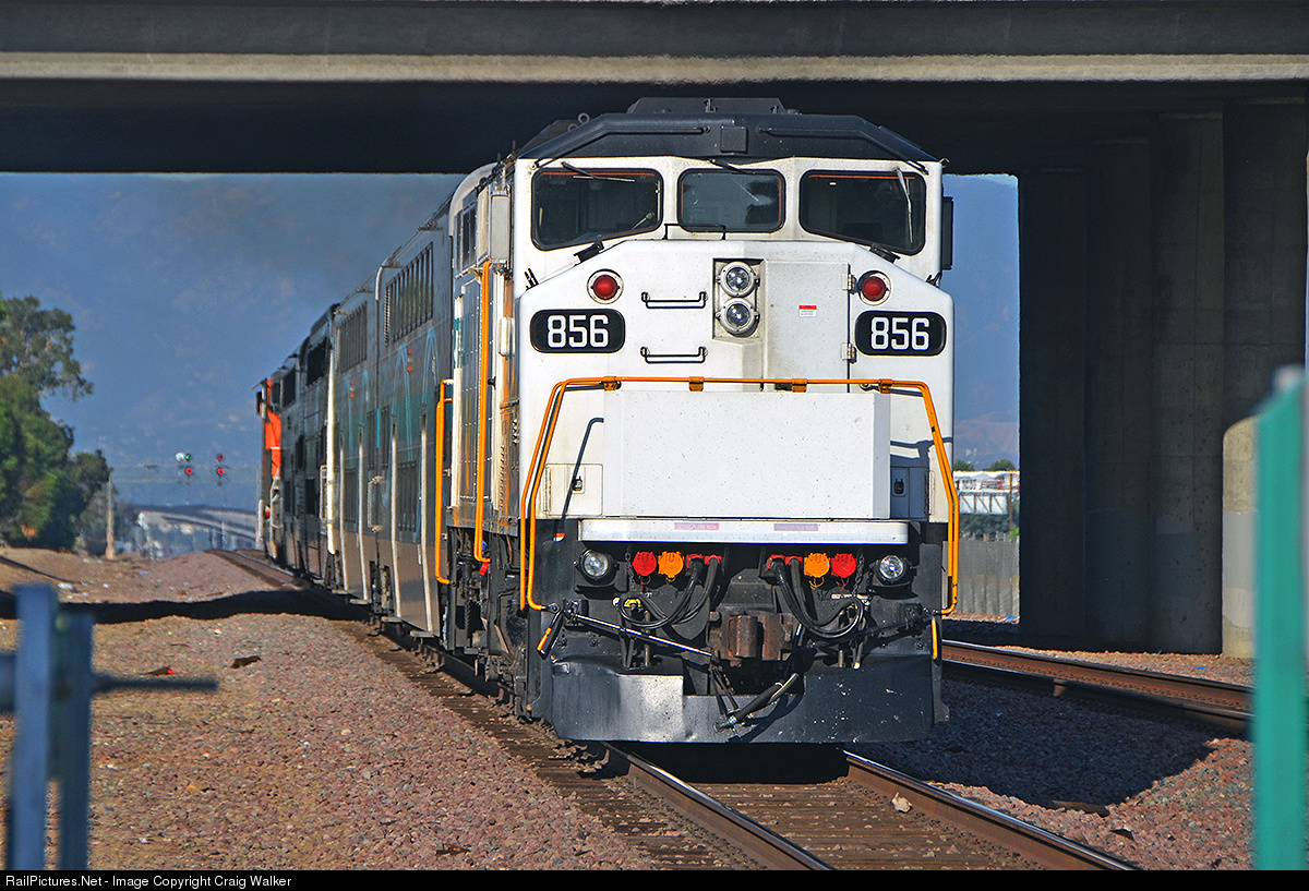 Metrolink train 751, operating from Riverside to Los Angeles, departs the La Sierra station in western Riverside, California, on August 13, 2016. One of the leased BNSF AC4400CWs (5629) is barely visible on the front of the train as it passes under the La Sierra Avenue overpass on its way west.