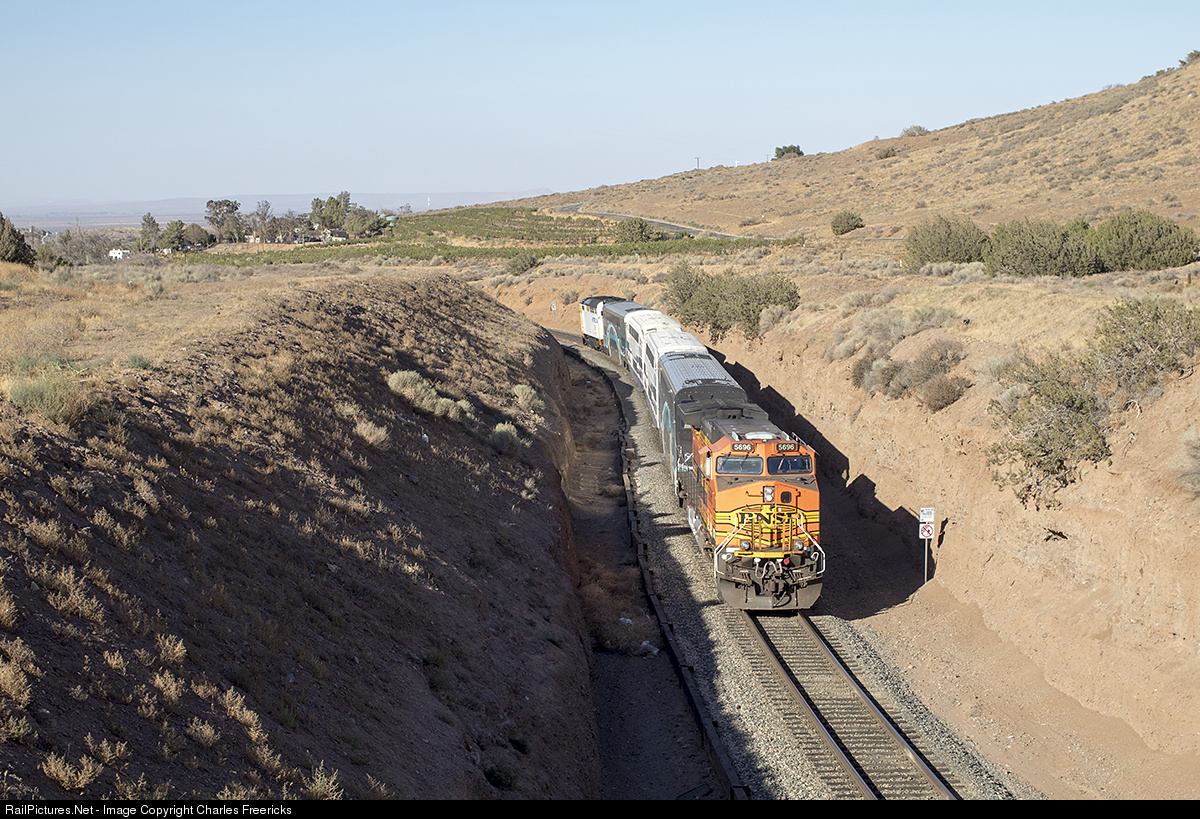 | Having just crested Vincent Grade, a Metrolink to Lancaster begins the decent into Palmdale with an AC4400CW on its tail to lead on the trip back to LA. |