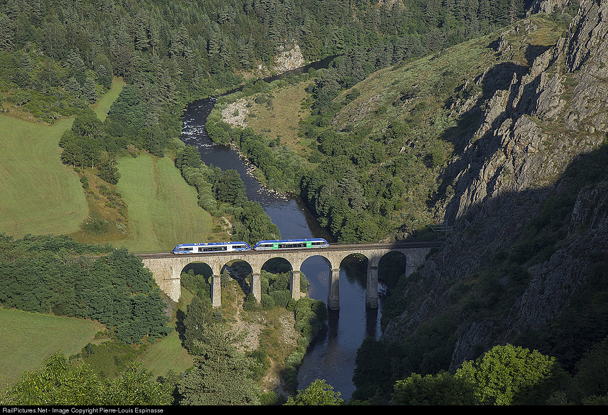 The regional train linking Clermont-Ferrand to Nimes is crossing the Thord viaduct situated in the Allier Canyon.