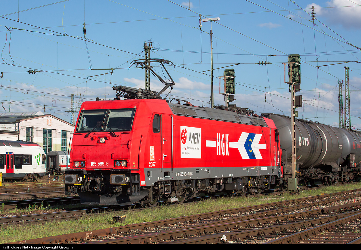 | 185 # 589, a Bombardier TRAXX F140 AC2 built in 2008, of RheinCargo Gmbh Neuss (former Hafen und Güterverkehr Köln HGK), with empty tank car train 48084 from Niederglatt to Karlsruhe in Basel Badischer Bahnhof. |