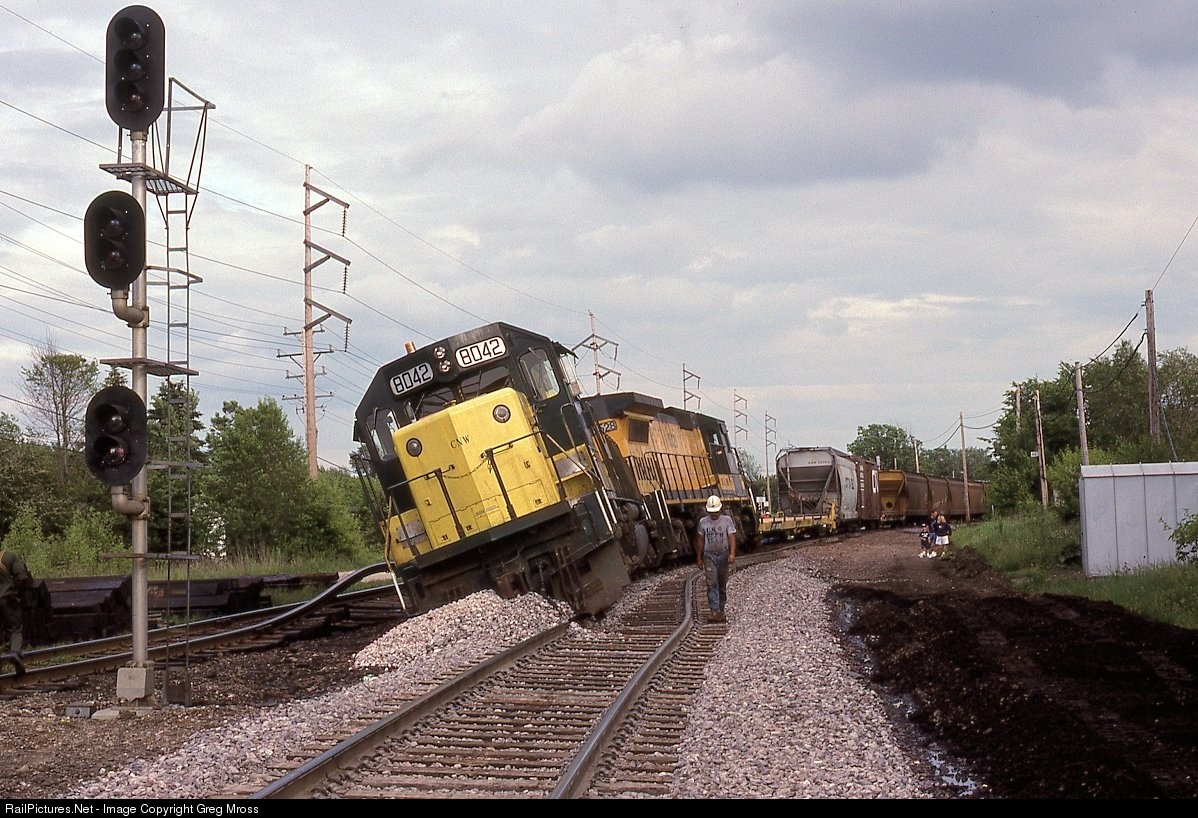 CNW 8042 and mate suffered a derailment in St. Francis in June of 1992. At least they stopped short of the signal! Good thing that sprung rail didn't cause any more damage.
