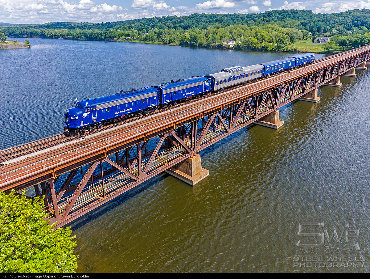 Pan Am Railway's attractive office car special train is seen crossing the Hudson River Bridge on the way into Mechanicville, NY on August 18, with PAR FP-9As PAR-1 and PAR-2 leading newly cleaned up ex-Wabash dome car - ST 102 - as well as office cars ST 100 and ST 101.