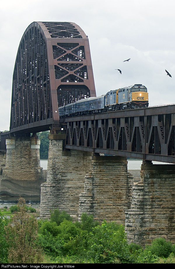 A CSX inspection train makes its way across the Ohio River as it heads north for Seymour before turning east on the former B&O to Cincinnati.