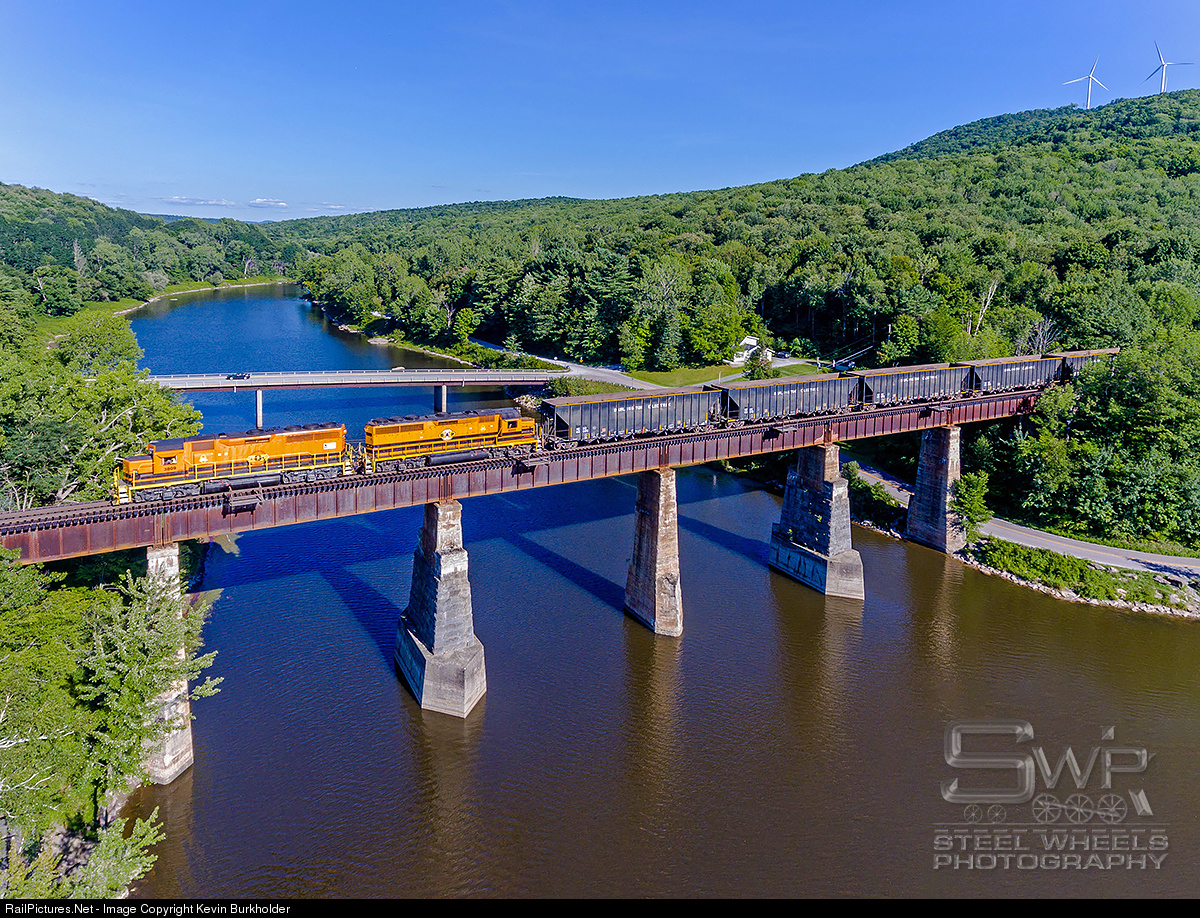 | The empty Burlington Electric wood chip train - symbol NECR 500 - is seen returning to Swanton, Vermont from Burlington for another train load of chips for the Joseph C. McNeil Generating Station. The train is led by NECR GP40CU 3809 and BPRR GP40 3000 and seen crossing the Lamoille River at Georgia, VT, as the windmills turn atop the hill for the Georgia Mountain Community Wind project. |