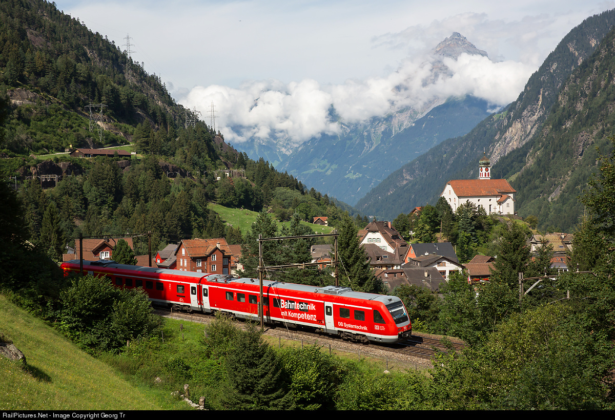| Tilting diesel powered test train of DB Systemtechnik 612 # 901/902 on a measuring run over the Gotthard mountain line, coupled (not visible) with ICN RABDe 500 # 038. Because the german test train has no swiss train protection systems, the ICN has to run in front. The text on the red train means "railway technology with expertise". |