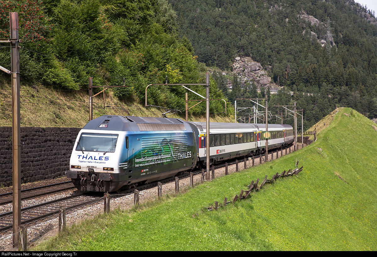 Re 460 # 005 with THALES publicity paint scheme is pulling Interregio 2421 from Zürich to Locarno on the uppermost level of the loops at Wassen.
