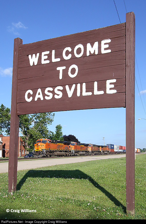 The daily westbound afternoon hotshot Z-train from Chicago, IL, to Portland, OR, is racing west on the Aurora Sub. Here the the train makes good time as they pass thru the town of Cassville about 30 miles north of East Dubuque.