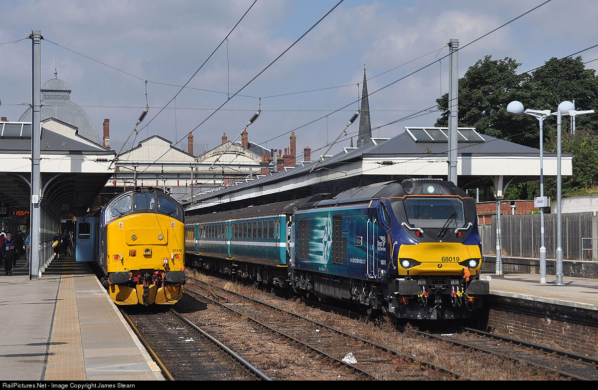 | With 50 years between them in age 37419 and 68019 stand side by side at Norwich with the two Anglian 'short sets'. These two trains are running to cover for unavailable DMU's between Norwich and Great Yarmouth/Lowestoft with two locomotives each top and tailing three Mk2 coaches. |