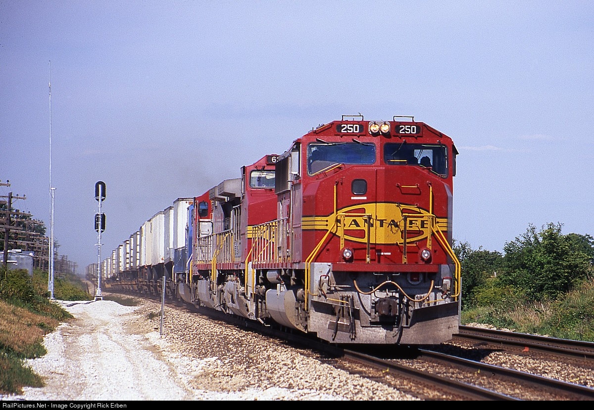 Slamming through Cameron, IL on the 4th of July is a westbound intermodal outfit with ATSF 250, 621, 687 and CR 5558.