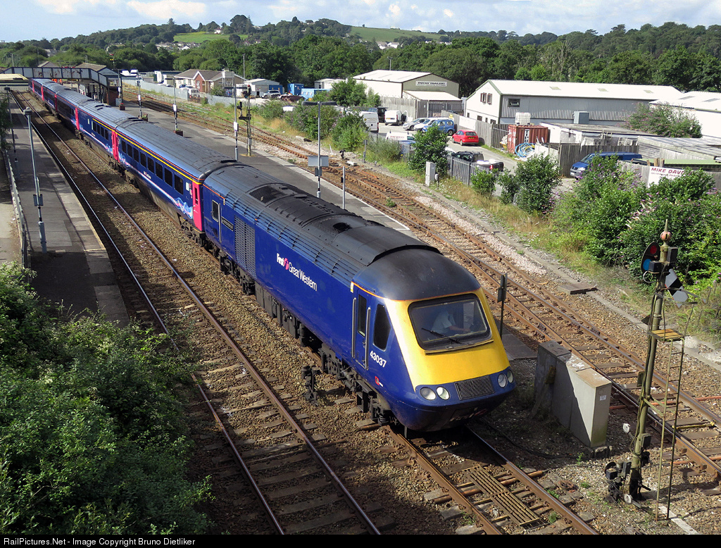 | Beautiful place on the bridge for train watching: Passenger train Penzance - London Paddington in the station Par with semaphore signals in the morning sun. The bridge you see on #586705 |