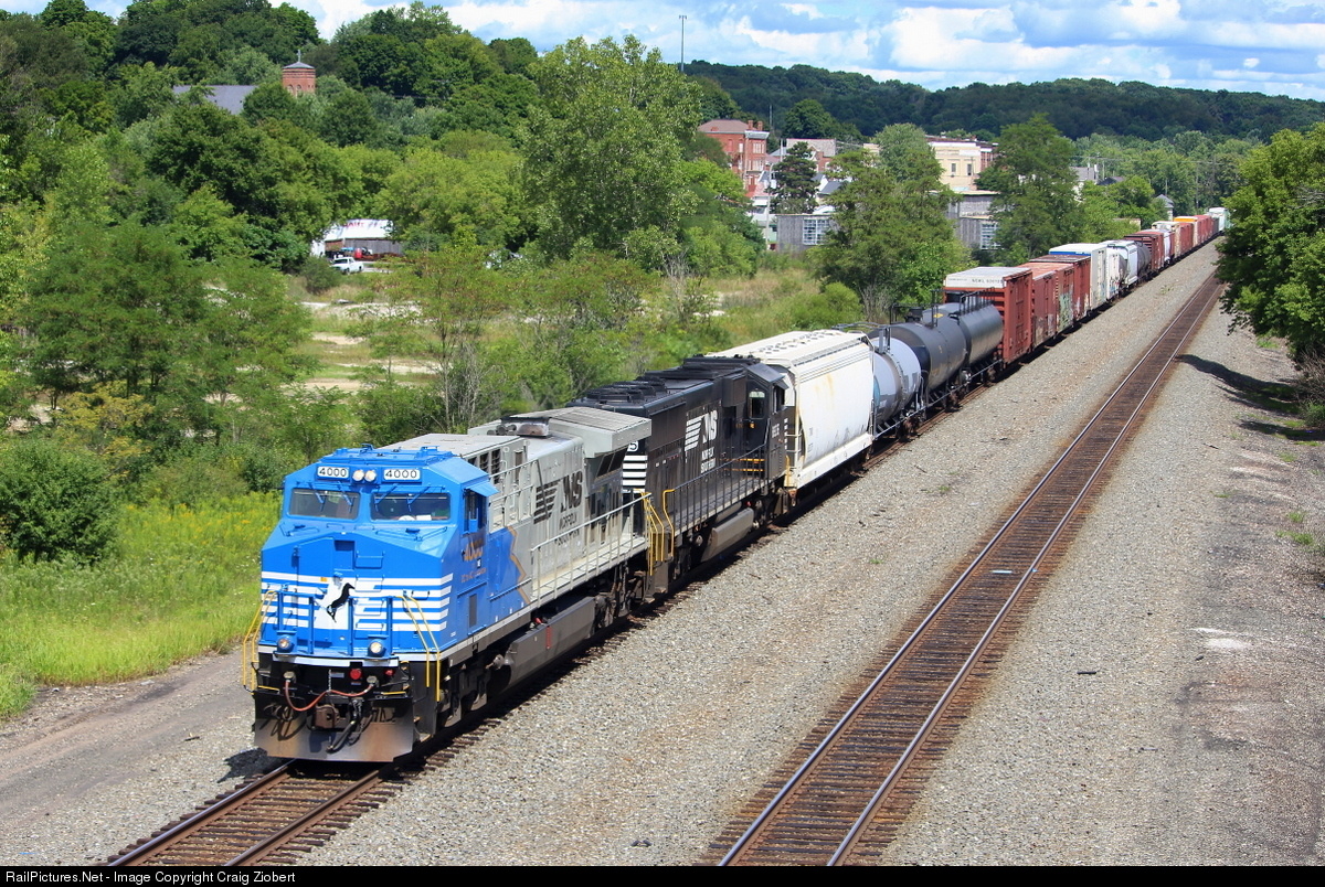| NS #4000 DC to AC Conversion unit leads manifest train 11K west through Leetonia, OH on the NS Fort Wayne Line. Photo taken from the Rt 344 Bridge over Washington Street. |