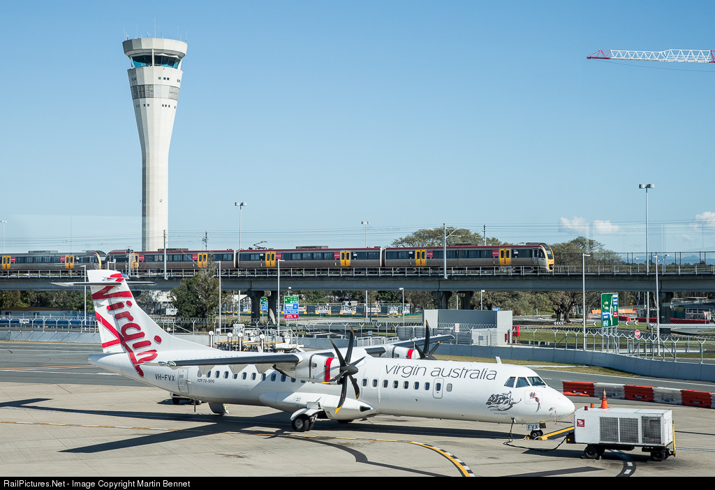 | An IMU160 class EMU set departs Brisbane Airport's Domestic Terminal, with a service to the Gold Coast via the city. On the ground is a Virgin Australia ATR 72-500. |