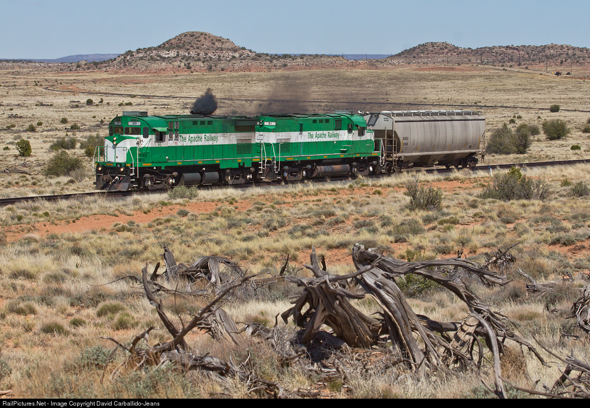 A pair of Apache Railway locomotives bring back one, lonely, hopper car back to Snowflake after picking it up in Holbrook. The train left Holbrook with eight cars (six tank cars and two hopper cars), but set them out along the route back to Snowflake. With the Apache rarely running nowadays, being able to see these green and white locomotives run is a nice sight; even if it is just with one car.