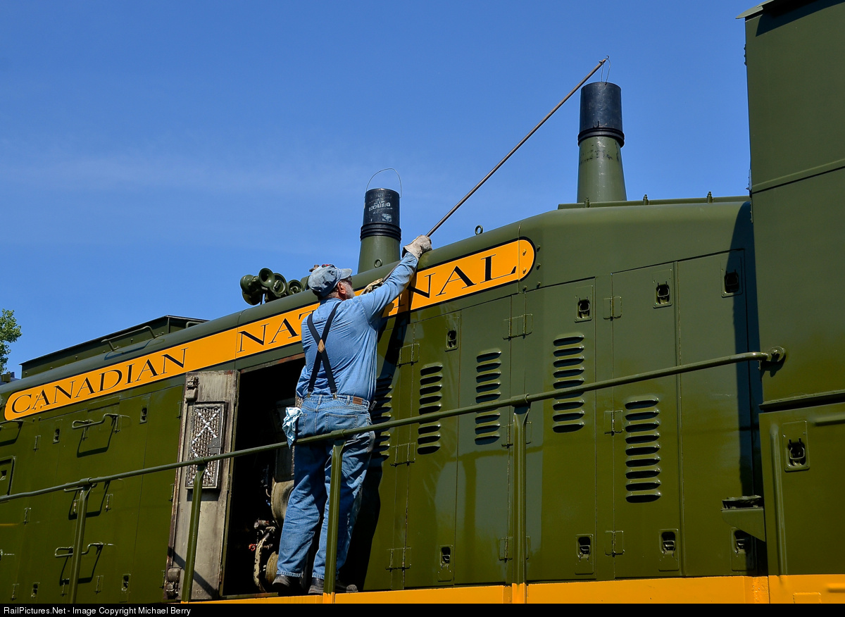 | Capping the stacks. A volunteer at Exporail is capping the second of two stacks on CN 1382 after shutting down the engine and then pulling two buckets out of the long hood. The engine has just performed some switching moves. |