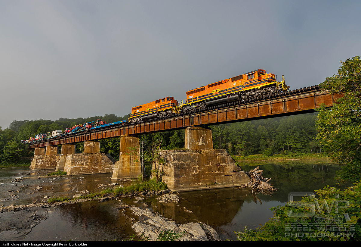 As the early morning fog began lifting, a hole opened up for the New England Central Railroad's 323X-24 - the Carnival Express - train that is hauling equipment for the James E. Strates Carnival, which opens in Burlington, Vermont, on Friday. The NECR SD40-2 3405 and GP40-2W 3015 lead the 42-car (26 loads/15 empties - some equipment trucked from Buffalo to Burlington ahead of the train movement) over the White River at West Hartford at 0730 hrs on August 24.