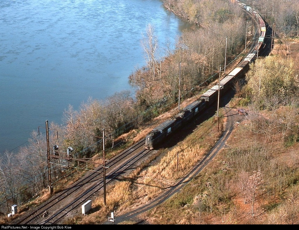 | Two Penn Central GG-1s lead an eastbound manifest down the Susquehanna Valley at the west end of Lake Siding, as seen from the aerie of Chickies Rock. |